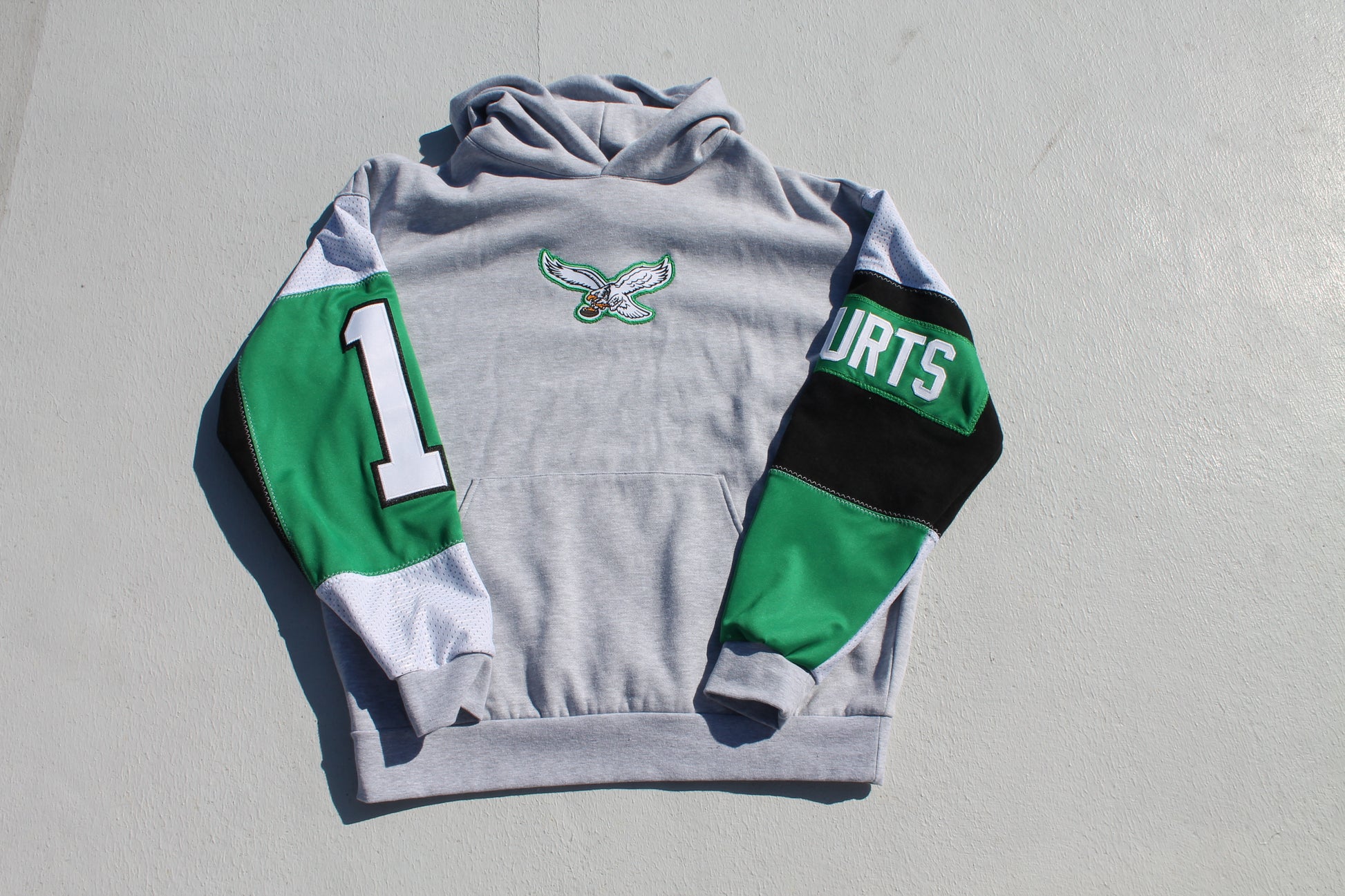 One of a kind handmade patchwork sweatshirt featuring a reworked Eagles jersey and denim!