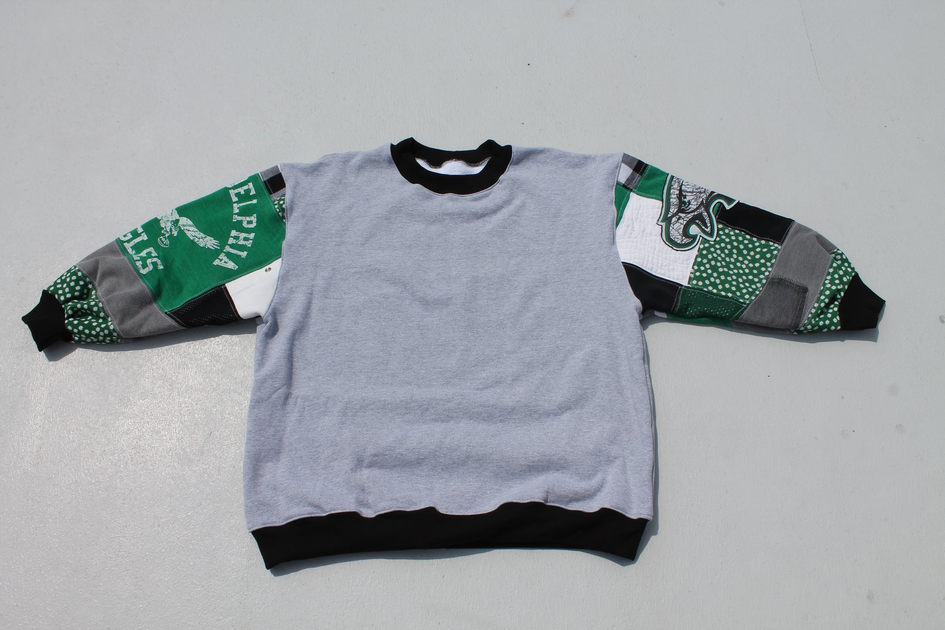 One of a kind handmade patchwork sweatshirt featuring reworked Eagles tees & denim!