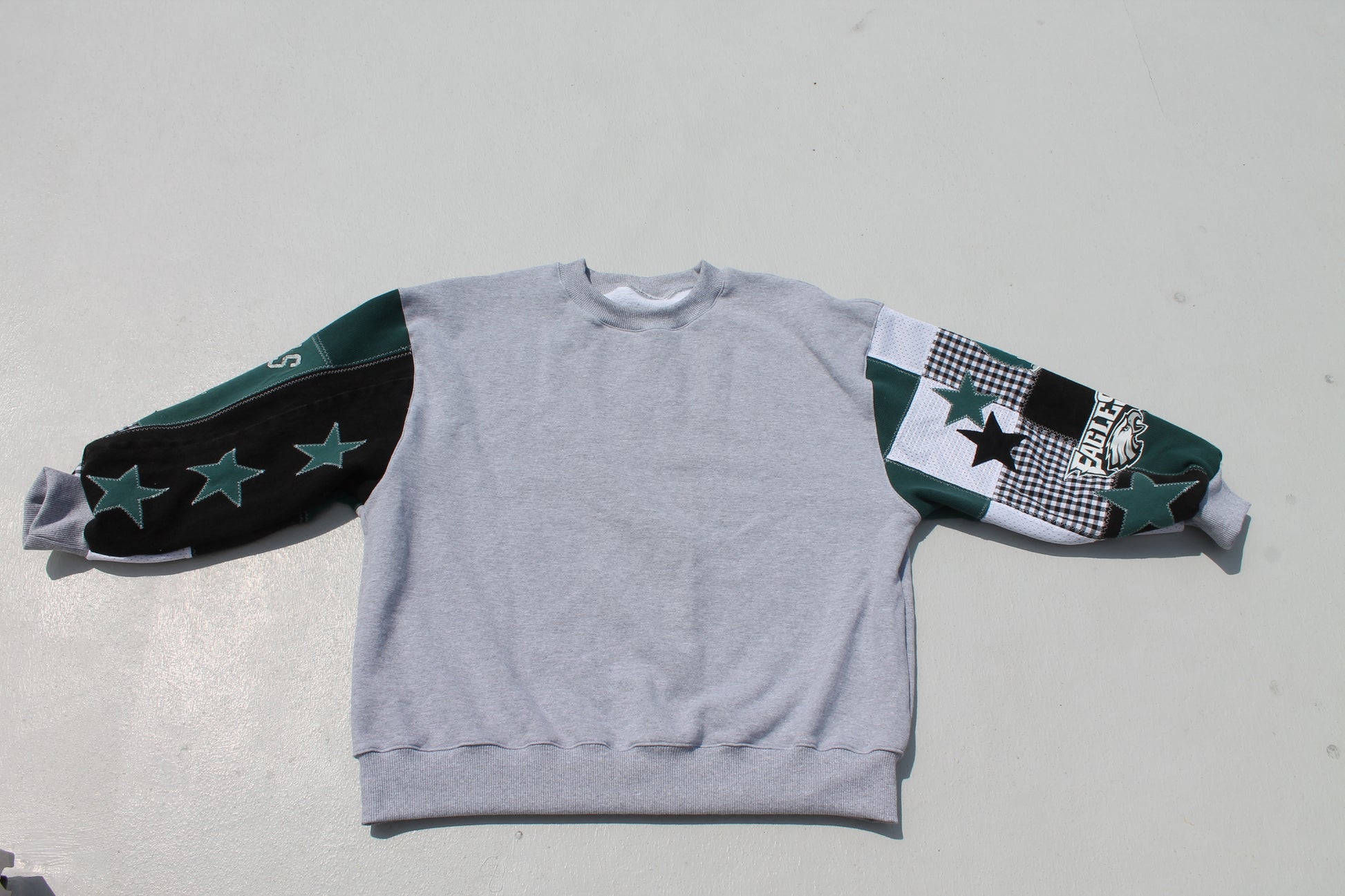 One of a kind handmade patchwork sweatshirt featuring reworked Eagles tees & denim!