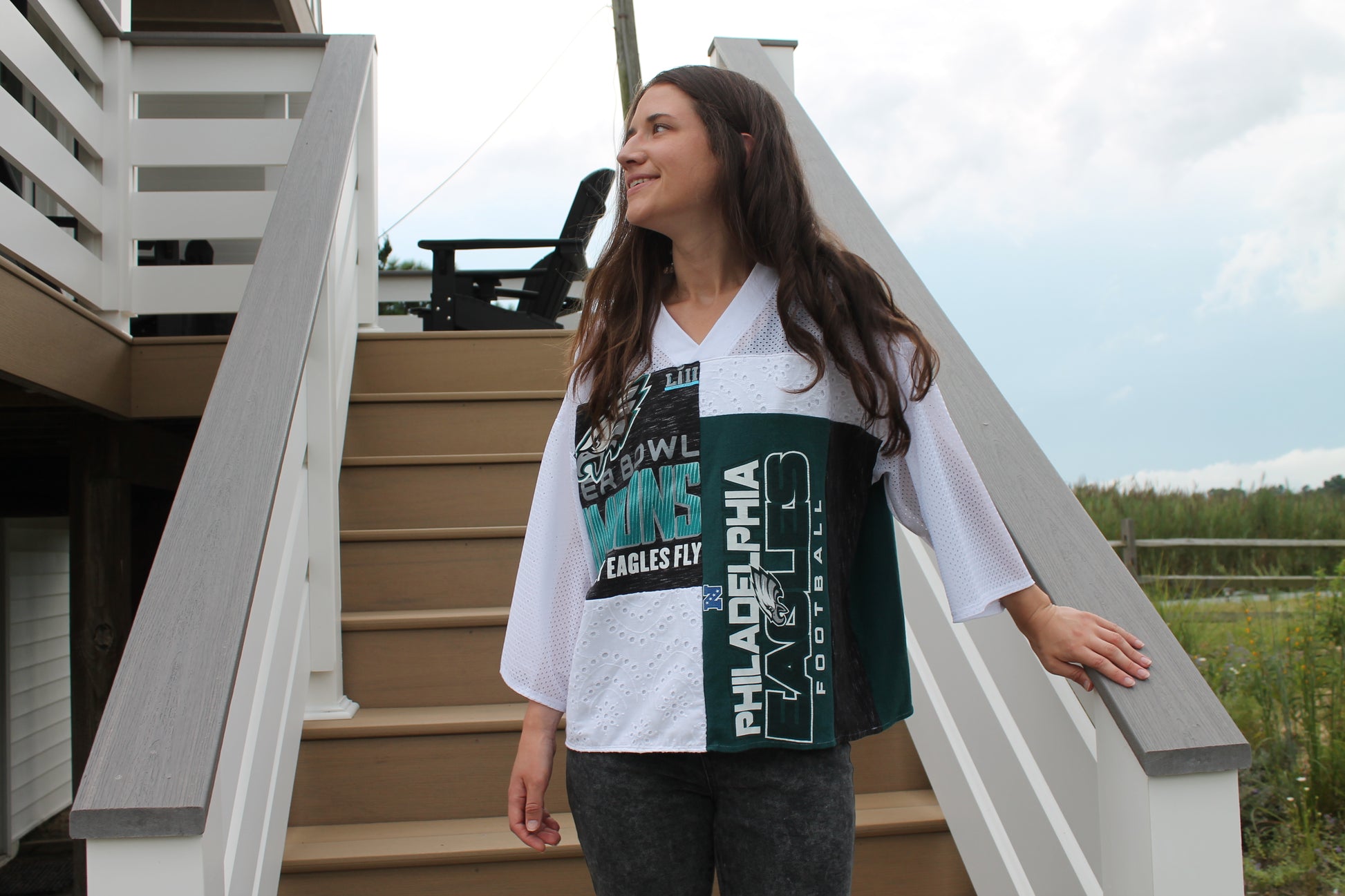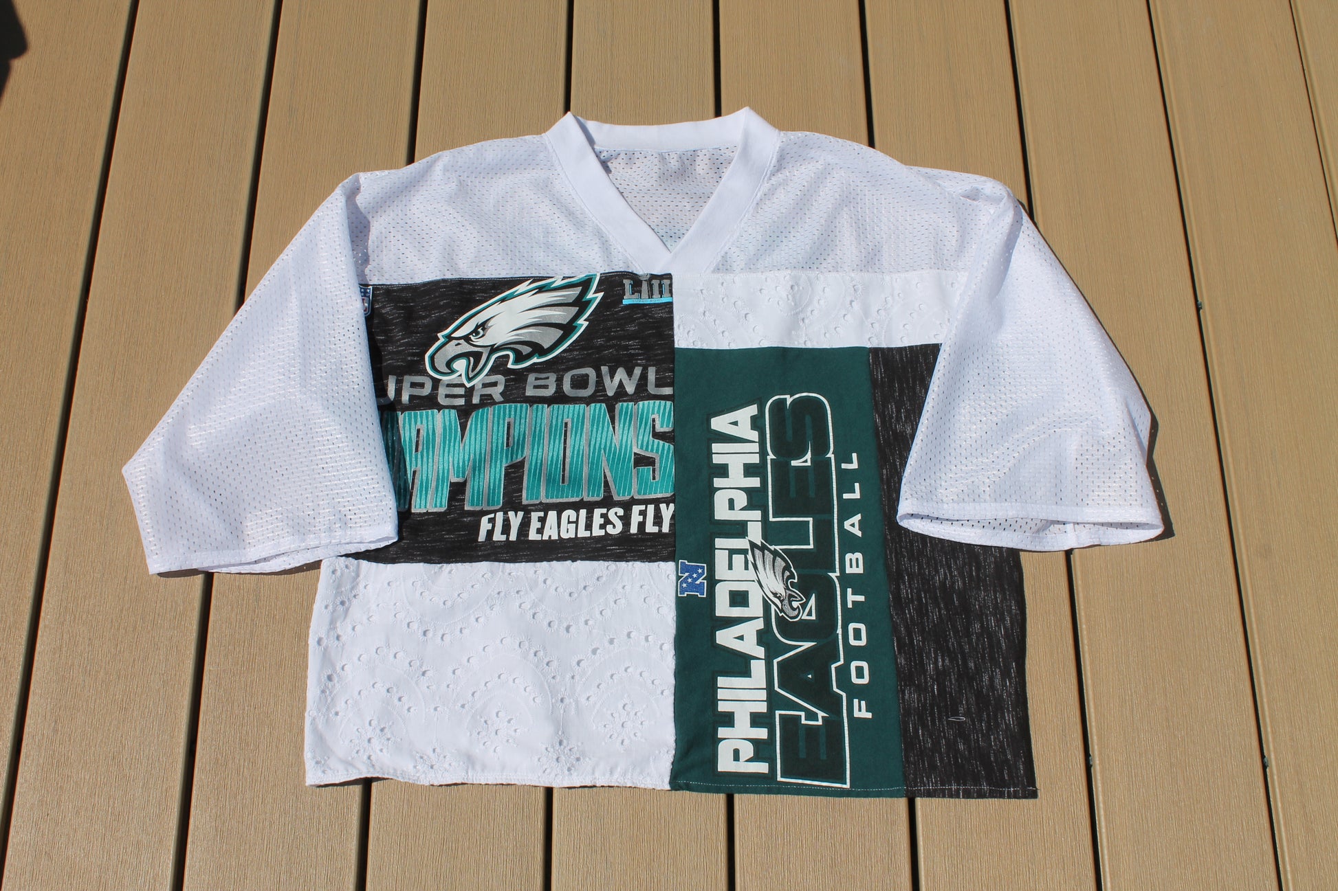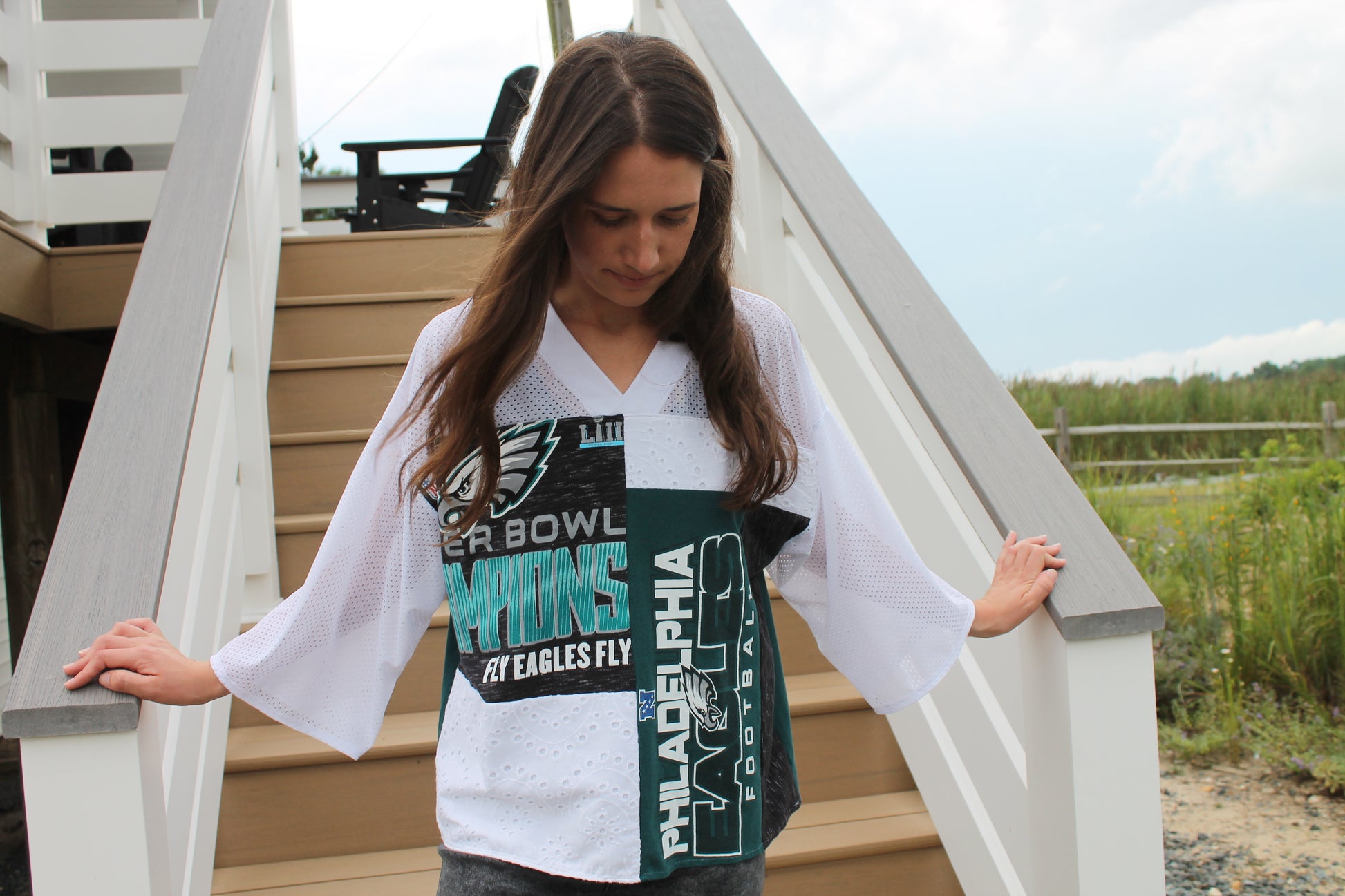 One of a kind handmade patchwork jersey featuring reworked Eagles tees!