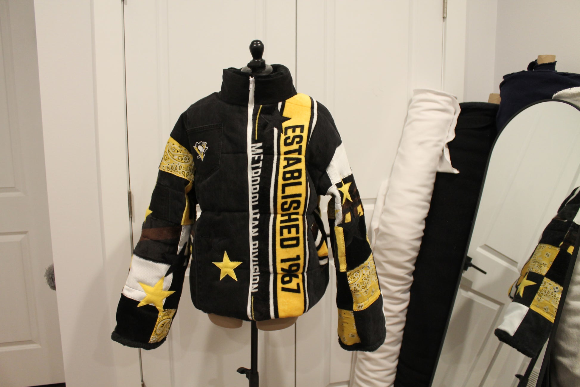 One of a kind handmade puffer jacket reworked from a Penguins blanket, bandanas, and denim!