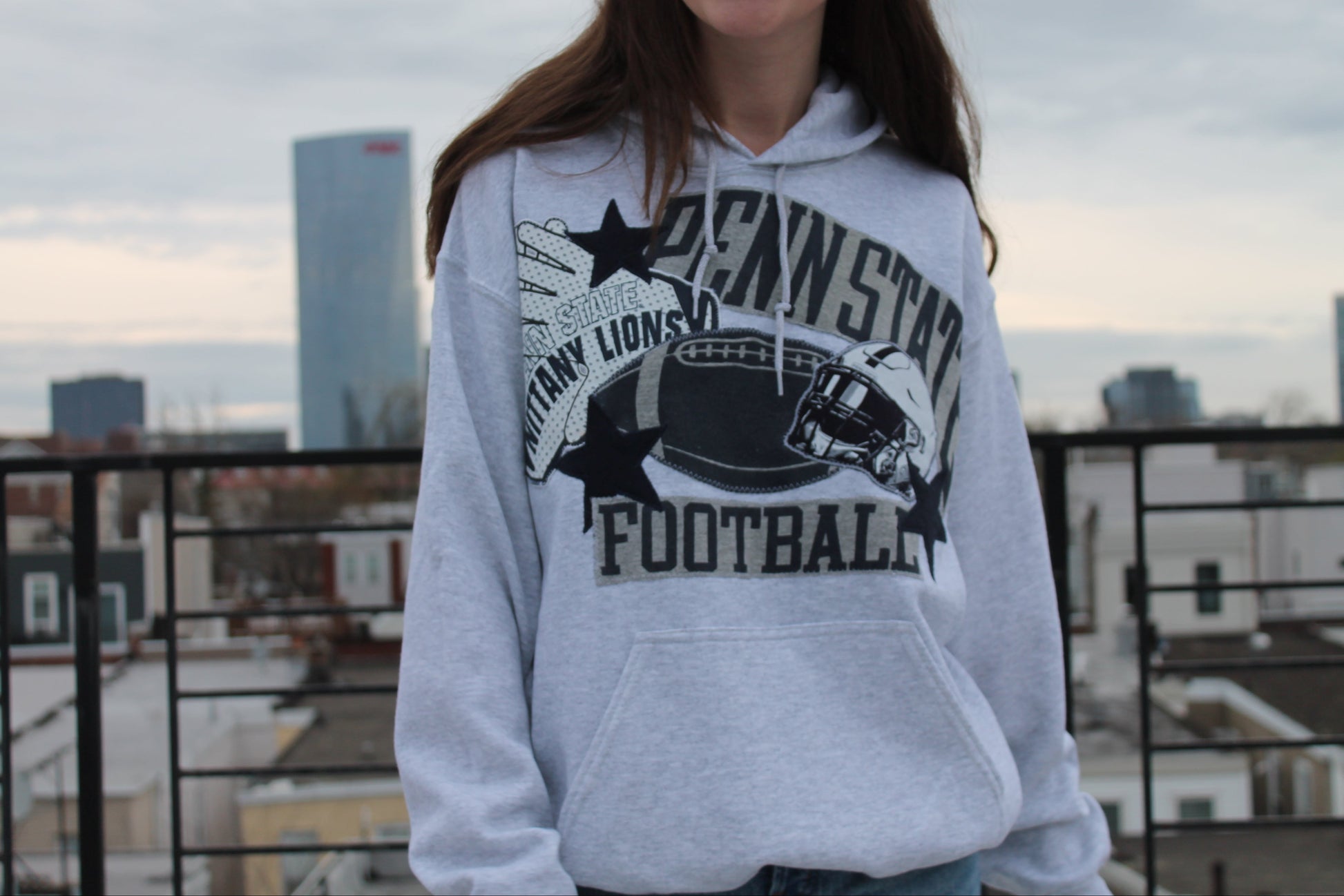 Features a hand cut & sewn collage upcycled from Penn State t-shirts
