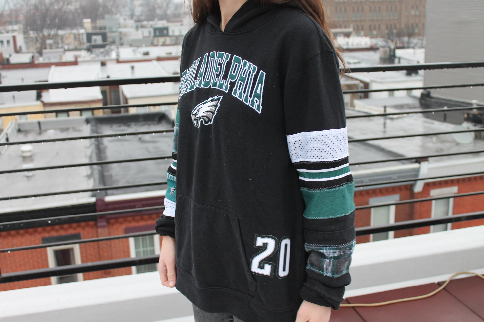 One of a kind reworked Eagles sweatshirt that features hand cut and sewn patchwork.