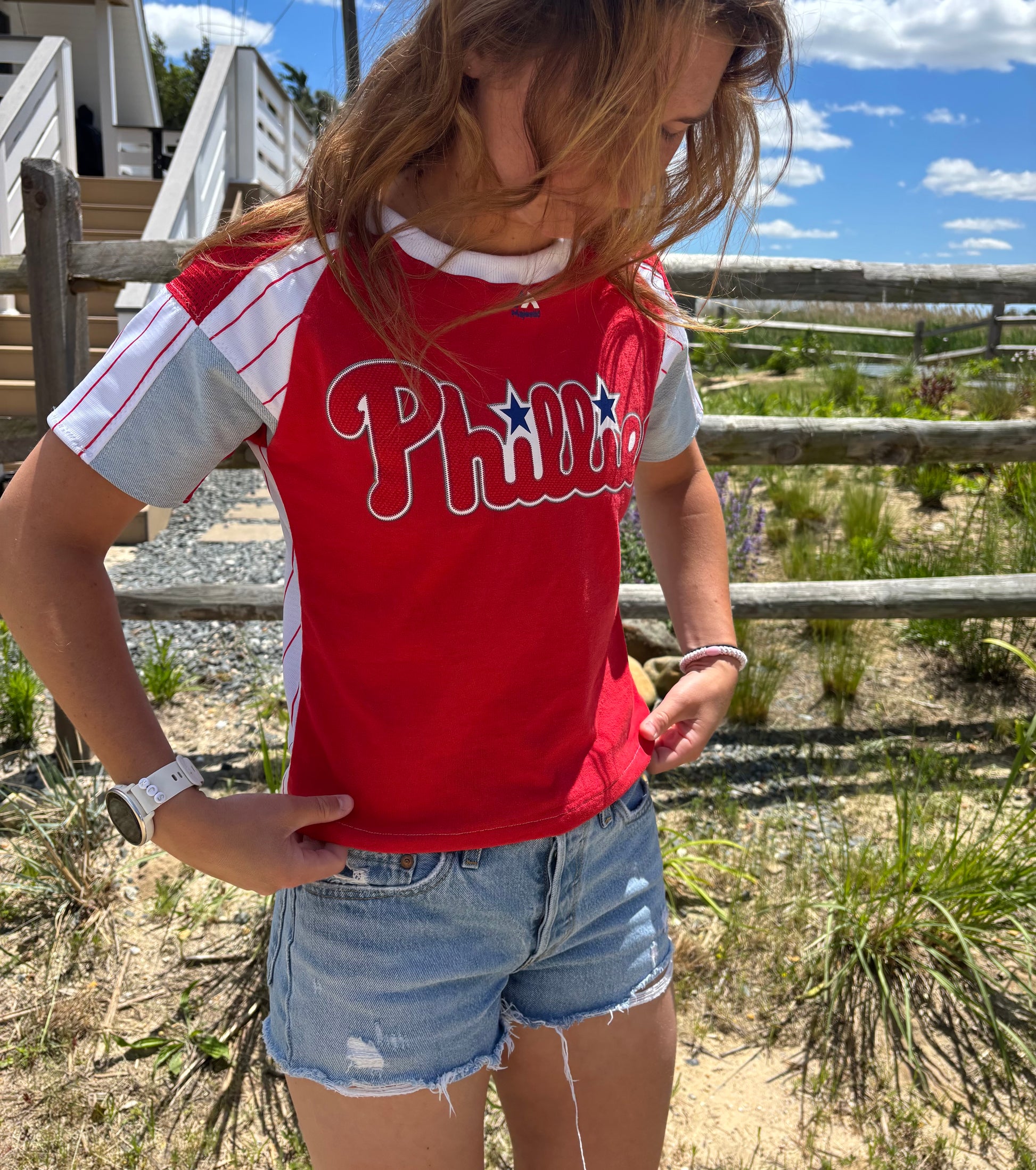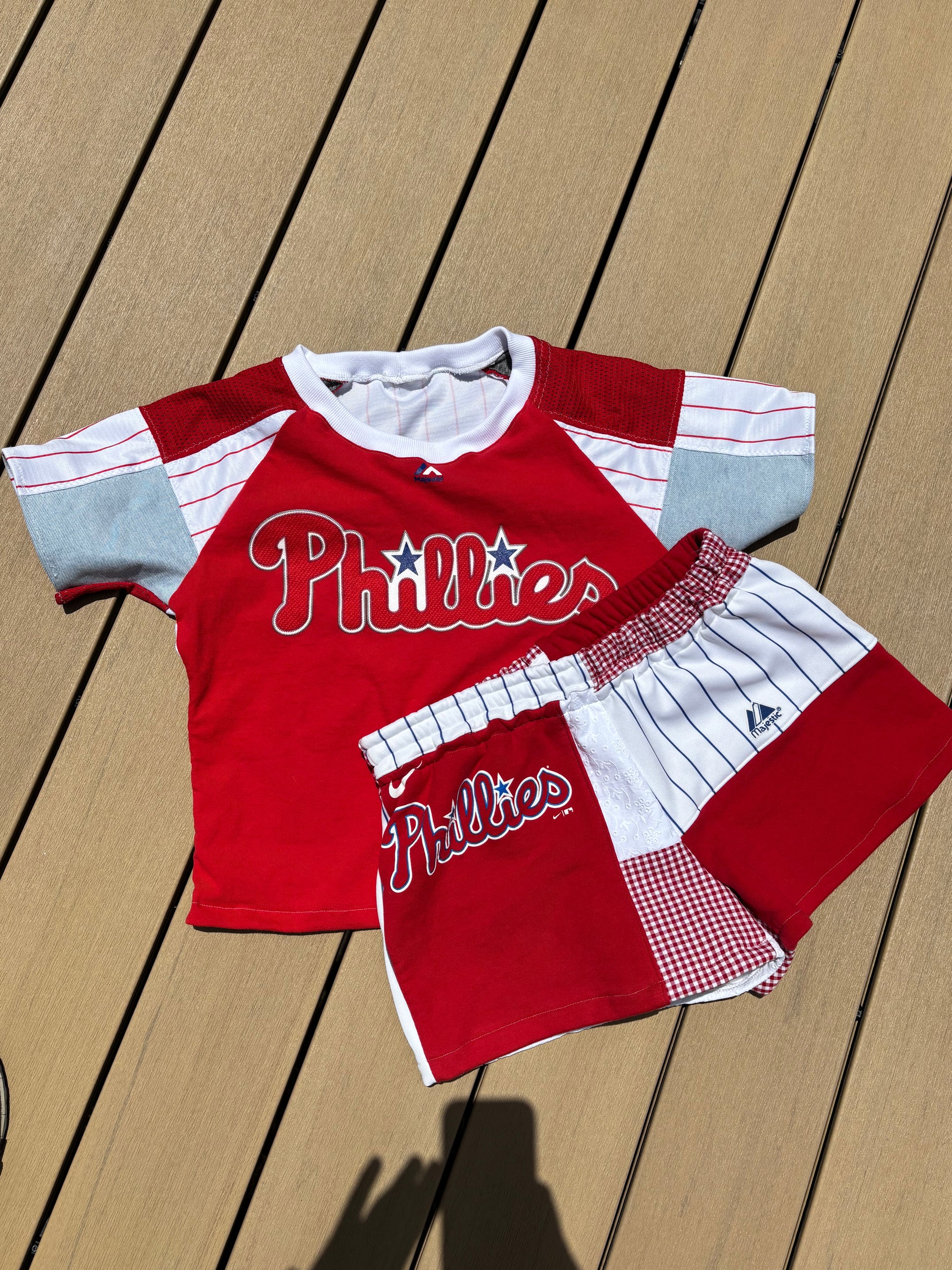 One of a kind handmade patchwork tee featuring upcycled Phillies pieces!