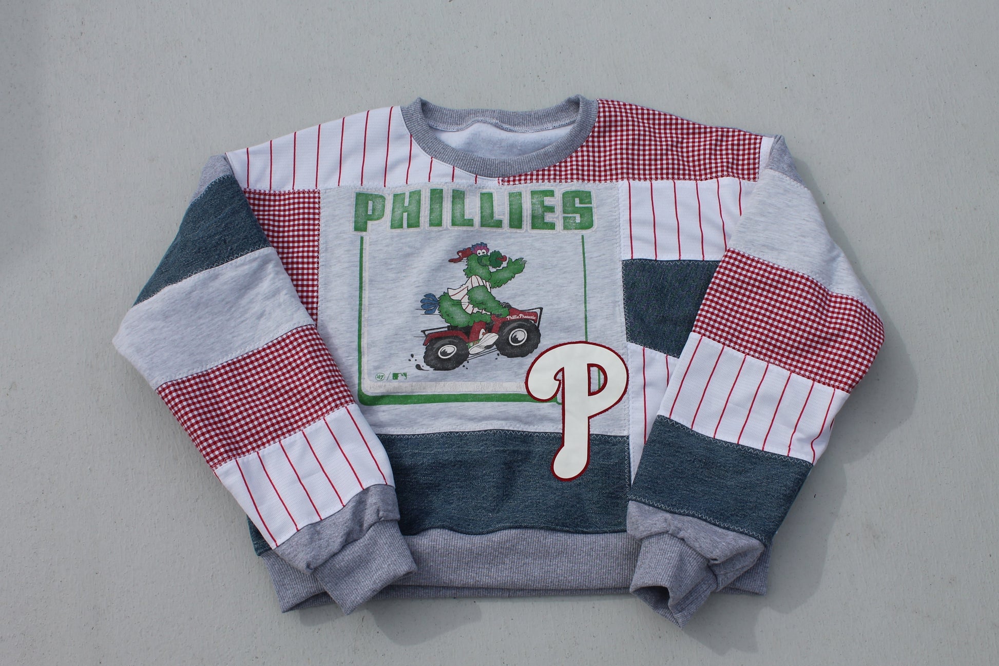 One of a kind handmade patchwork sweatshirt featuring reworked Phillies tees!